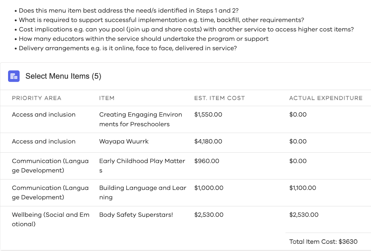 When selecting the appropriate menu items for each Campus, you as the Kinder Teacher and the Educational Leader, need to ensure that you are choosing the learning that will support what the children need as a group.