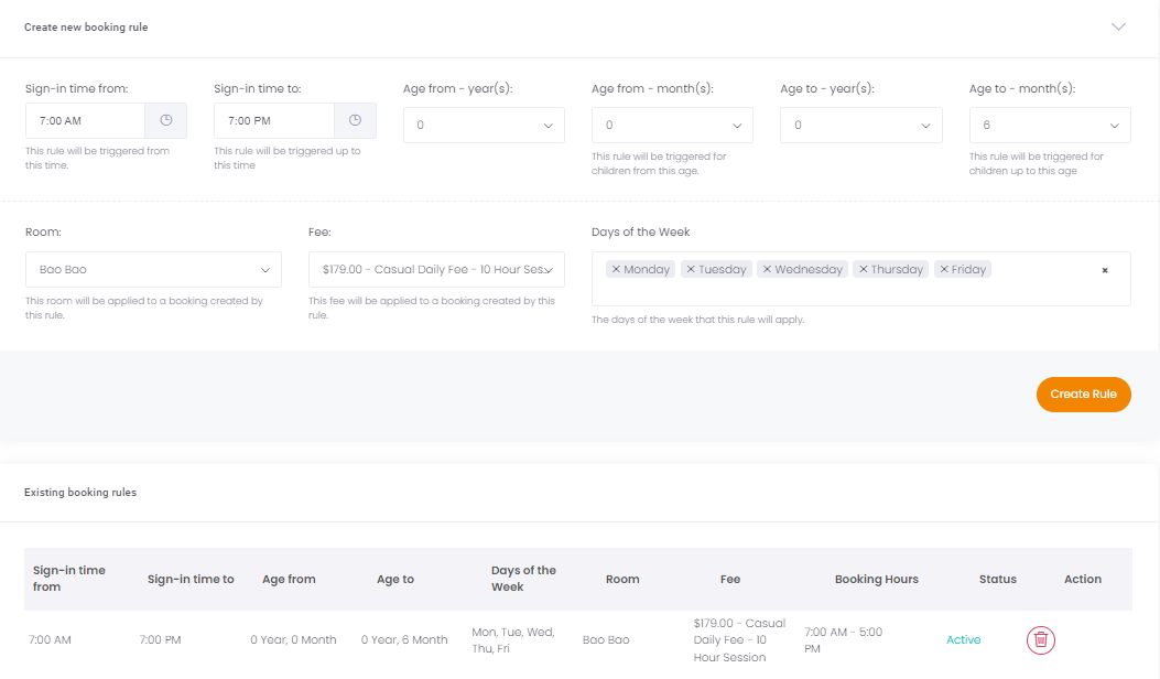 Xplor Booking rules allow us to set parameters when a a parent signs into a Woodlands Campus without a booking; the system will allocate the child to the correct room and apply the casual fee.